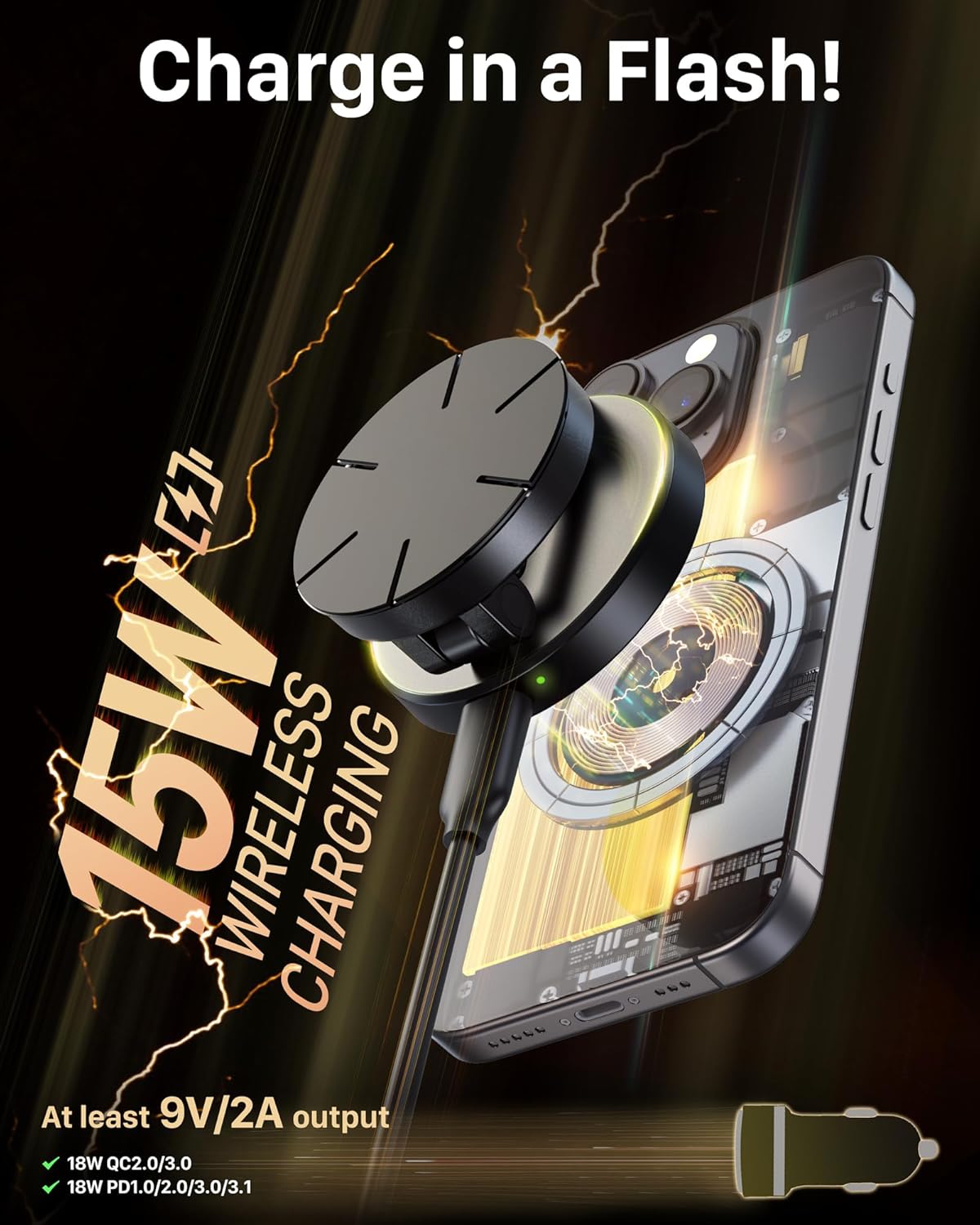 - Works for All Phones: The car phone holder mount is compatible with iPhone 17, 17 Plus, 17 Pro, 17 Pro Max, iPhone 16, 16 Plus, 16 Pro, 16 Pro Max, iPhone 15, 15 Pro, 15 Plus, 15 Pro Max, 14, 14 Pro, 14 Pro Max, 14 Plus, iPhone 13, 13 Pro, 13 Pro Max, 13 Mini, iPhone 12, 12 Pro, 12 Pro Max, 12 Mini, or with any Mag-Safe-supported phone cases. It can also be used with non-magnetic phones with the included metal ring. It is also compatible with Samsung, Pixel etc