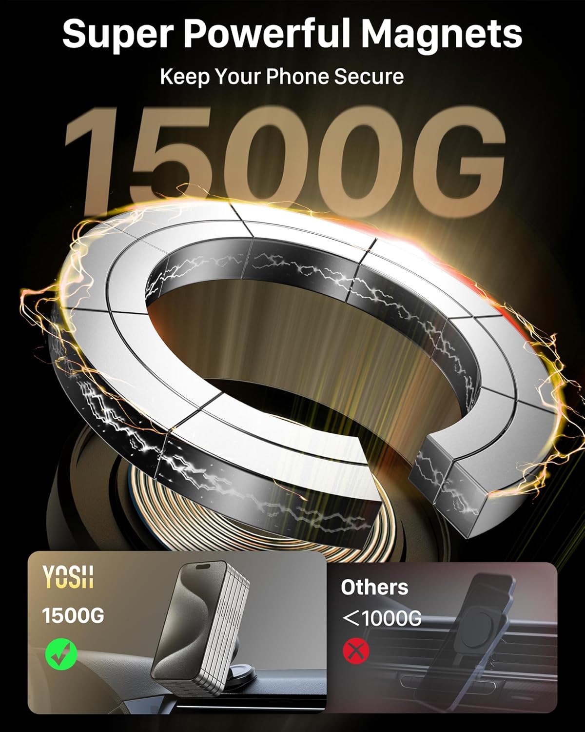 - Upgraded Large Magnets: YOSH introduces the Mag-Safe Car Mount with 20 x N55 magnets, offering a strong 1.8 kg magnetic force. Your phone attaches securely within 0.1 seconds, ensuring firm stability and preventing accidental drops during your drive