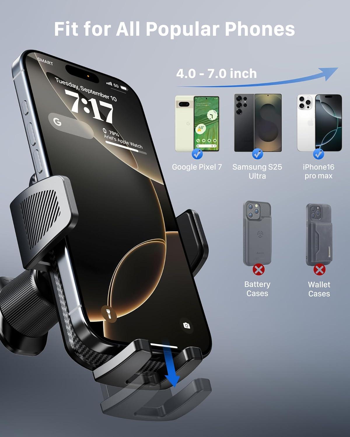 - Ultra-Lightweight Carbon Fiber Clamp: Designed with a carbon fiber clamp to minimize weight, this mount protects your vehicle’s air vents from strain or damage caused by heavy, traditional clamps. With high-temperature-resistant ABS plastic, the clamp is durable, scratch-proof, and built to withstand prolonged use without warping or cracking