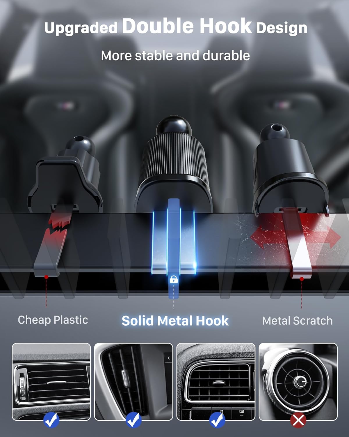 - Upgraded Metal Dual-Hook Design: Features dual metal hooks that grip the air vent securely, ensuring a firm hold in all driving conditions. It fits vent depths of 11 to 32 mm for maximum stability. Note: This mount does not fit round air vents (Mercedes/Audi)