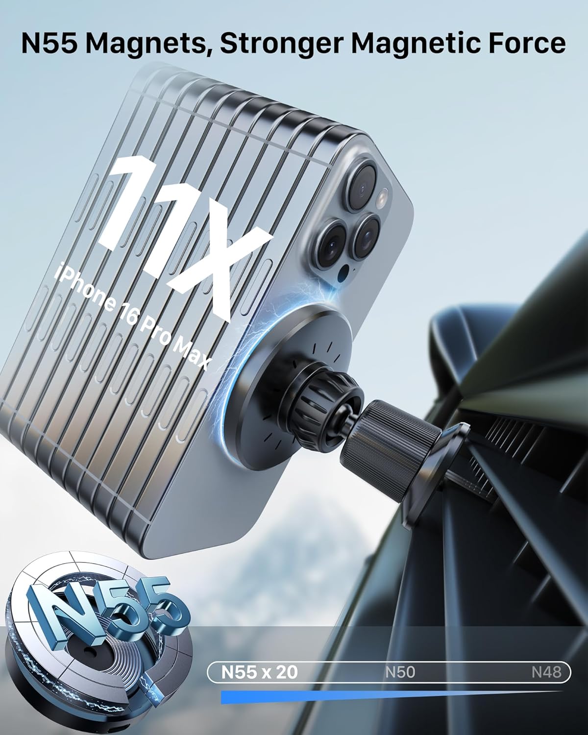 - Magnetic Car Charger with Powerful N55 Magnets – Ultra-Secure Hold: 20 ultra-thin (0.48 mm) N55 magnets deliver exceptional grip, keeping your phone firmly in place through sharp turns, rough roads, and sudden stops.